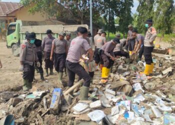 LHOKSEUMAWE - Personel Polres Lhokseumawe bersama BKO Brimobda Polda Kalimantan Timur melaksanakan kegiatan pembersihan lanjutan di SD Negeri 3 Sawang,...