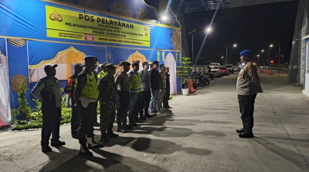 Lhokseumawe – Guna memastikan kesiapsiagaan personel dalam memberikan pelayanan dan pengamanan kepada masyarakat, Pos Pelayanan Operasi Ketupat Seulawah 2026 Polres Lhokseumawe menggelar apel malam di Pos Pelayanan Terminal Kandang, Jalan Medan–Banda Aceh, Kecamatan Muara Dua, Kota Lhokseumawe, Sabtu (14/3/2026) malam.
