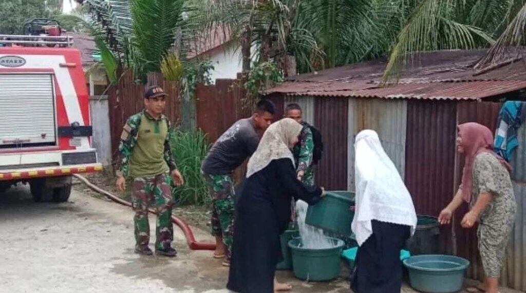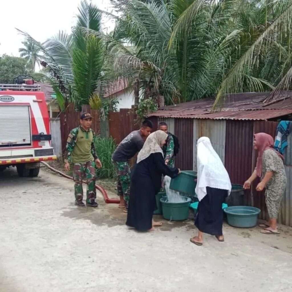 Subulussalam – Satgas TMMD Reguler ke-125 Kodim 0118/Subulussalam bekerja sama dengan Dinas Pemadam Kebakaran (Damkar) Kota Subulussalam menyalurkan bantuan air bersih menghadapi krisis air bersih akibat kemarau panjang di Desa Kuta Cepu, Kecamatan Simpang Kiri, pada Sabtu (26/7/2025).