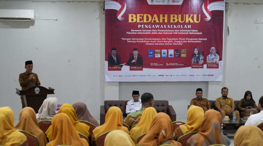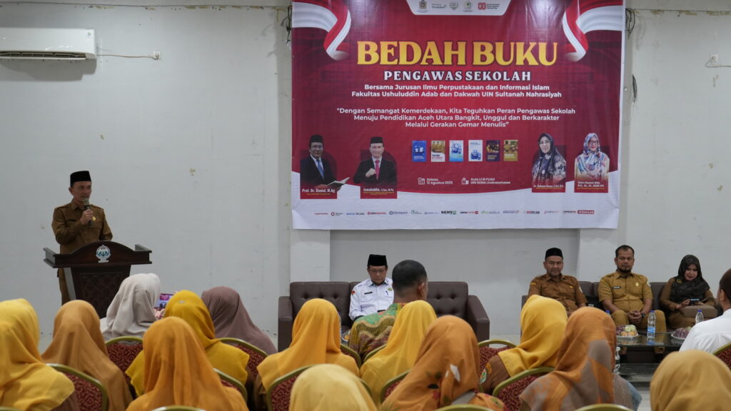Lhokseumawe – Jurusan Ilmu Perpustakaan dan Informasi Islam (IPII) Fakultas Ushuluddin Adab dan Dakwah (FUAD) UIN Sultanah Nahrasiyah (UIN Suna) menggelar Bedah Buku Pengawas Sekolah bertema “Dengan Semangat Kemerdekaan, Kita Teguhkan Peran Pengawas Sekolah Menuju Pendidikan Aceh Utara Bangkit, Unggul dan Berkarakter Melalui Gerakan Gemar Menulis” pada Selasa, 12 Agustus 2025 di Aula Lantai III FUAD UIN Suna, Lhokseumawe.