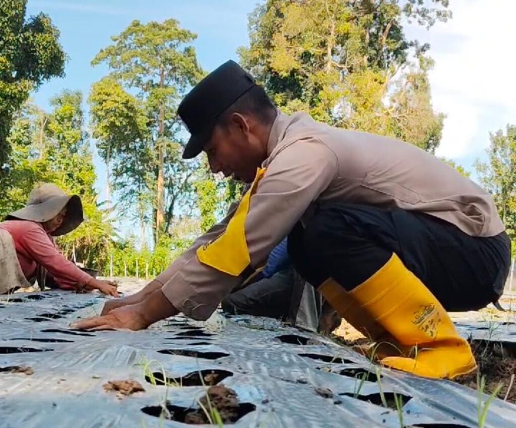 Bripka Hamzah tampak bersemangat membantu petani menanam bibit bawang merah di lahan yang sebelumnya tidak produktif. Masyarakat sangat antusias, dengan harapan tanaman ini dapat meningkatkan hasil pertanian dan memperbaiki kesejahteraan mereka.