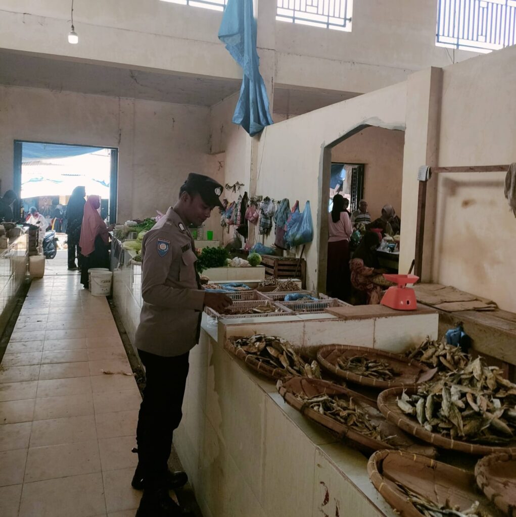 Patroli dialogis tersebut dilakukan oleh Aipda Indra Irawan dengan menyambangi para pedagang dan pengunjung pasar untuk memantau situasi kamtibmas sekaligus menyampaikan imbauan agar masyarakat tetap menjaga ketertiban dan keamanan lingkungan.