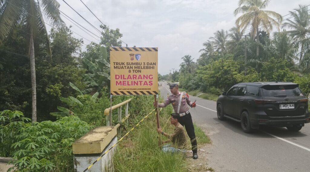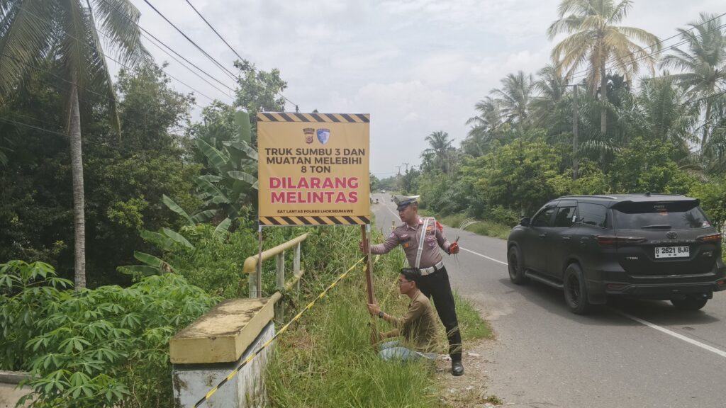 Lhokseumawe – Guna mengantisipasi kerusakan jalan dan kecelakaan lalu lintas, Satlantas Polres Lhokseumawe memasang spanduk imbauan larangan melintas bagi truk sumbu tiga di ruas Jalan Lintas KKA – Bener Meriah, tepatnya di KM 39 hingga perbatasan Aceh Utara – Bener Meriah, Sabtu (29/3/2025).