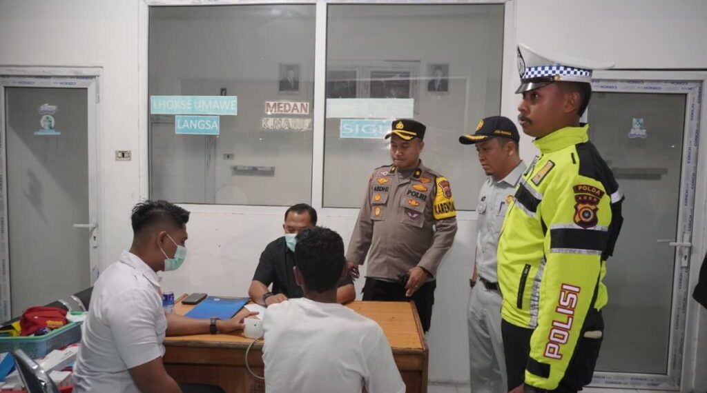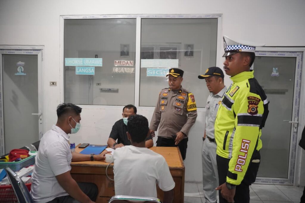 Lhokseumawe – Dalam upaya mencegah kecelakaan lalu lintas serta memastikan keselamatan penumpang, Polres Lhokseumawe melaksanakan kegiatan pemeriksaan kelayakan kendaraan (ramcek) dan tes urine bagi para sopir angkutan umum, baik travel maupun bus, di Terminal A Kandang, Kecamatan Muara Dua, Kota Lhokseumawe, Provinsi Aceh, Rabu malam (18/3/2026).