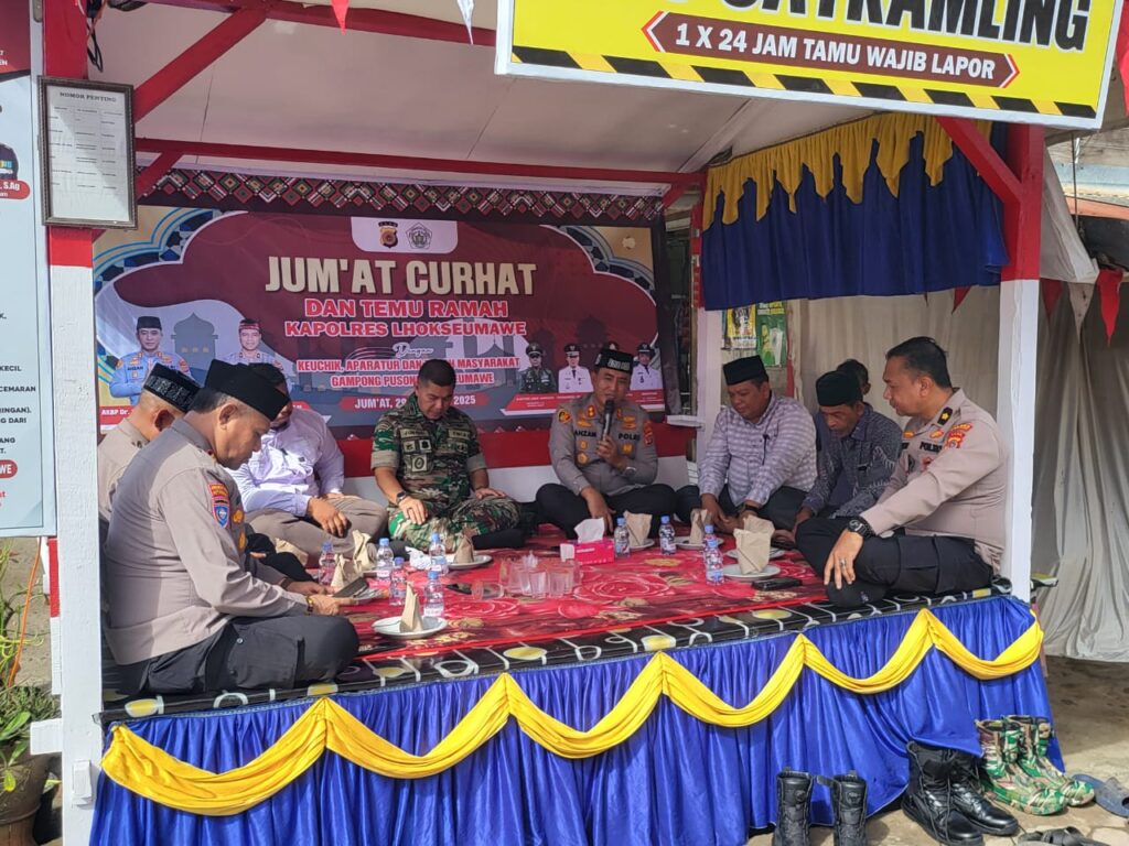 Lhokseumawe – Kegiatan Jum’at Curhat Kapolres Lhokseumawe bersama perangkat Desa Pusong Lama berlangsung penuh keakraban di Pos Jaga Sat Kamling, Jalan Cut Mutia, Kecamatan Banda Sakti, Jumat (29/8/2025).