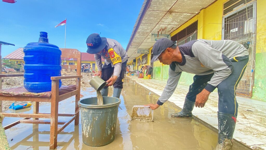 Puluhan personel dikerahkan. Water canon, mobil tangki air, dan dam truk bekerja silih berganti. Lumpur yang sempat menutup lorong dan ruang kelas perlahan tersingkir. Papan tulis kembali terlihat putih, lantai kembali mengering, dan halaman sekolah mulai bersih.