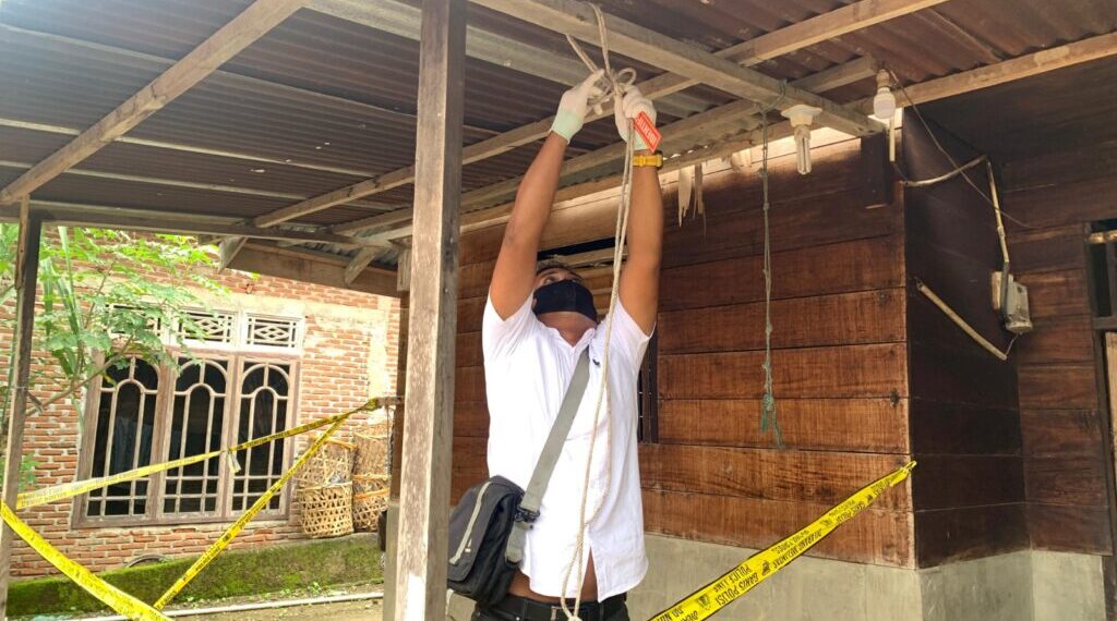 Beberapa saat kemudian, saksi melihat korban sedang berdiri di atas kursi di teras rumah, mencoba mengikat tali ke balok tiang sambil berbicara di telepon. Tiba-tiba korban memasukkan tali ke lehernya dan langsung menjatuhkan tubuh.