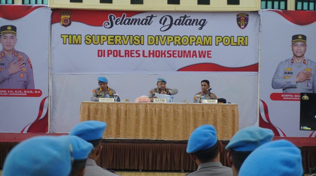 Lhokseumawe – Divisi Profesi dan Pengamanan (Divpropam) Polri melaksanakan kegiatan Supervisi Kewilayahan Fungsi Propam Tahun Anggaran 2025 di jajaran kewilayahan Polda Aceh. Kegiatan ini berlangsung di Aula Wira Satya Polres Lhokseumawe, Kamis (8/5/2025) siang.