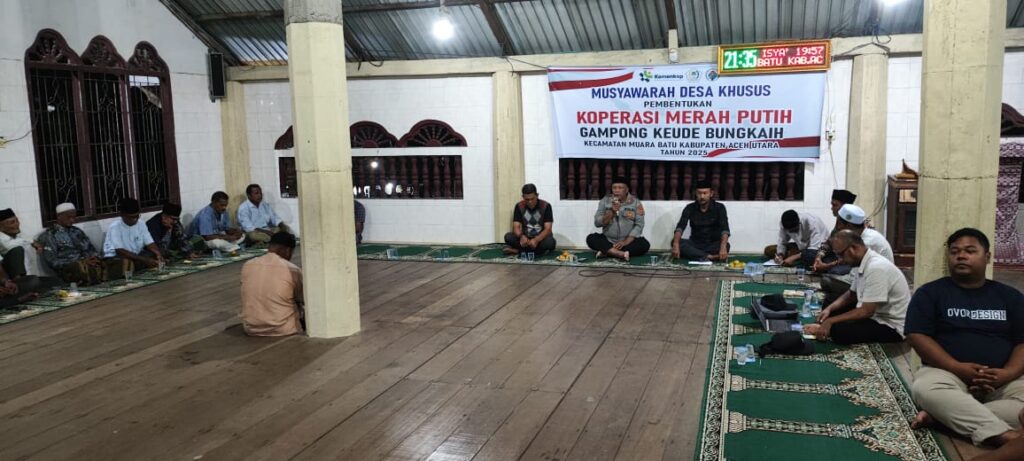 Muara Batu – Kapolsek Muara bati hadiri rapat pembentukan Koperasi Merah Putih Gampong Bungkaih, Kecamatan Muara Batu, Kabupaten Aceh Utara,. Minggu (25/5/2025) malam