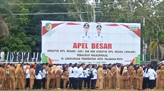 Palangka Raya: Usai memimpin apel besar di Halaman Kantor Wali Kota Palangka Raya, Wali Kota Fairid Naparin bersama Wakil Wali Kota Ahmad Zaini menggelar halalbihalal dengan seluruh ASN dan non-ASN, Selasa (8/4/2025).