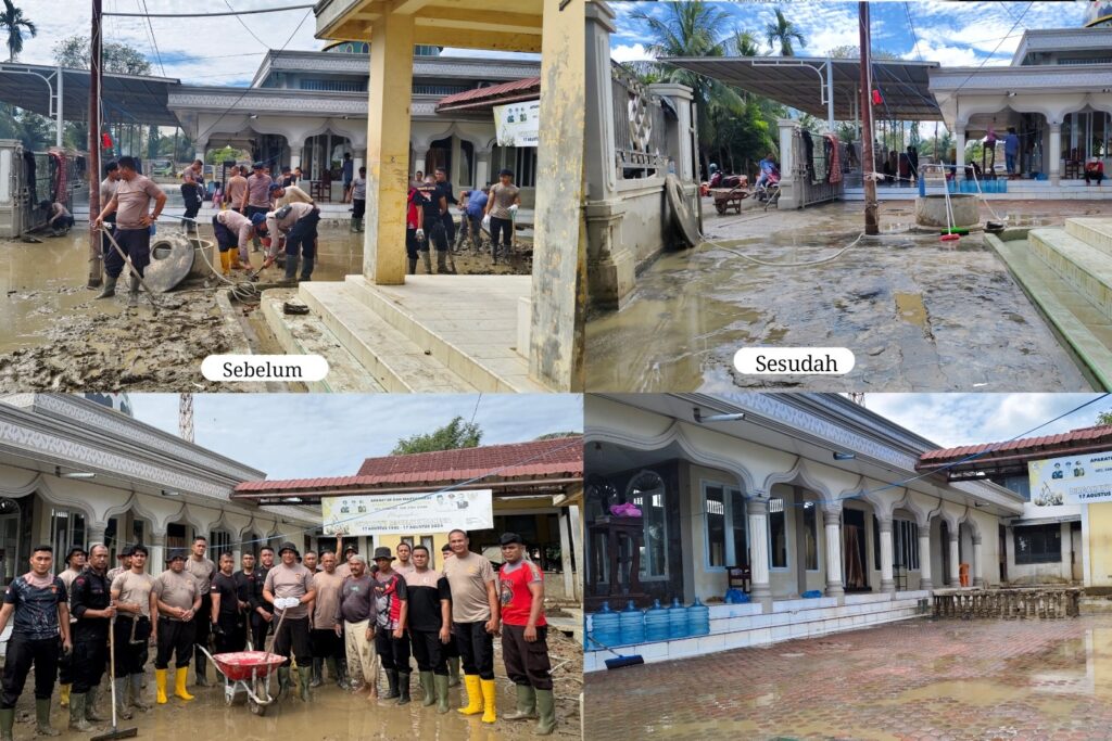 Aceh Utara – Meunasah Blang Peuria, Kec. Samudera, Kab. Aceh Utara, Provibsi Aceh yang sebelumnya dipenuhi lumpur akibat banjir kini kembali bersih dan layak digunakan oleh masyarakat. Perubahan tersebut merupakan hasil kerja bakti personel Polres Lhokseumawe yang dilaksanakan sejak Kamis dan berlanjut hingga Jumat pagi (19/12/2025) sekitar pukul 11.30 WIB.