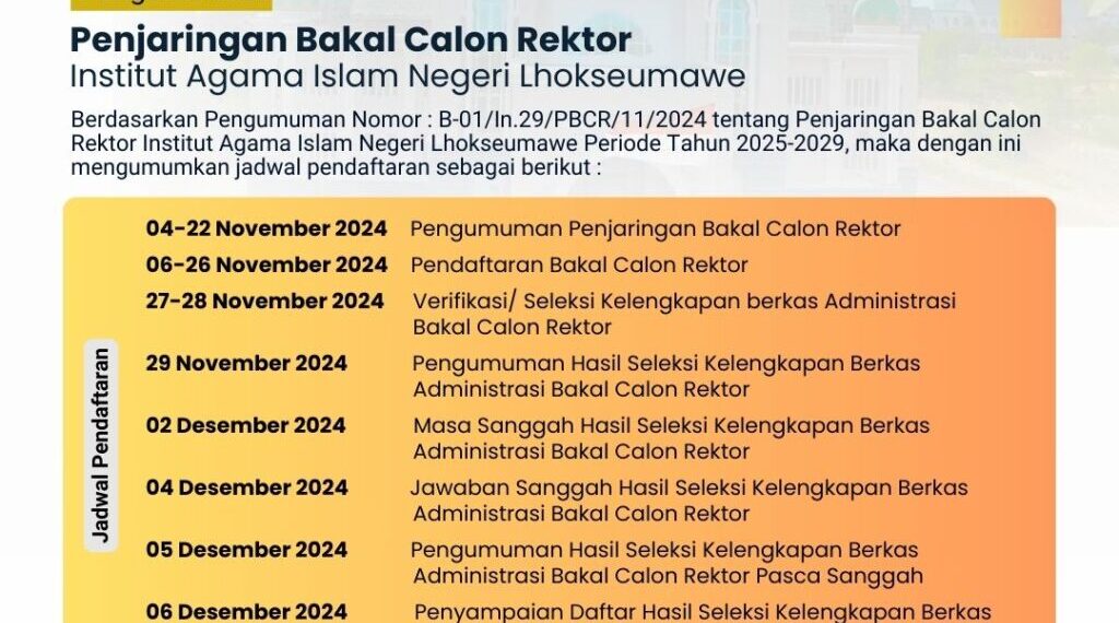 Lhokseumawe – Institut Agama Islam Negeri (IAIN) Lhokseumawe resmi membuka penjaringan bakal calon rektor untuk periode kepemimpinan 2025-2029. Hal ini diumumkan dalam surat pengumuman nomor B-01/In.29/PBCR/11/2024 yang terbit tanggal 4 November 2024.