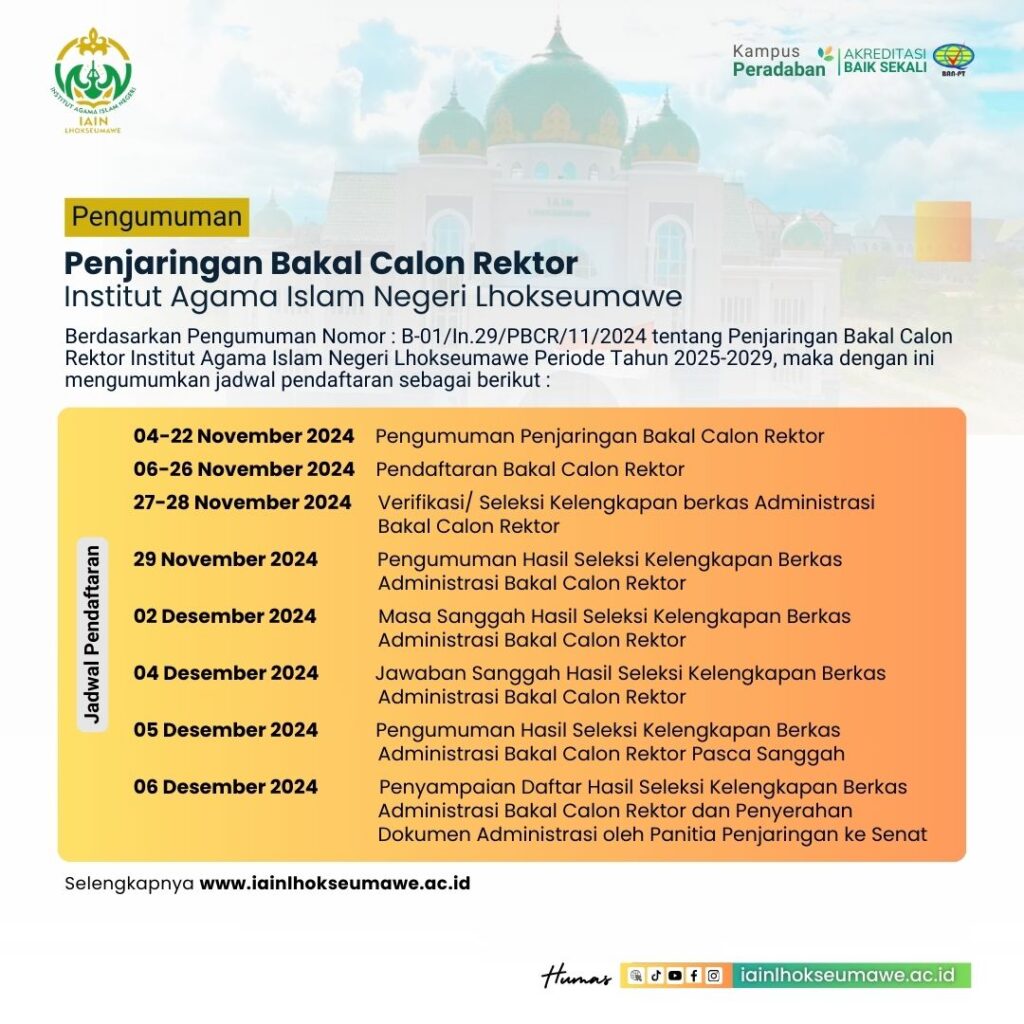 Lhokseumawe – Institut Agama Islam Negeri (IAIN) Lhokseumawe resmi membuka penjaringan bakal calon rektor untuk periode kepemimpinan 2025-2029. Hal ini diumumkan dalam surat pengumuman nomor B-01/In.29/PBCR/11/2024 yang terbit tanggal 4 November 2024.