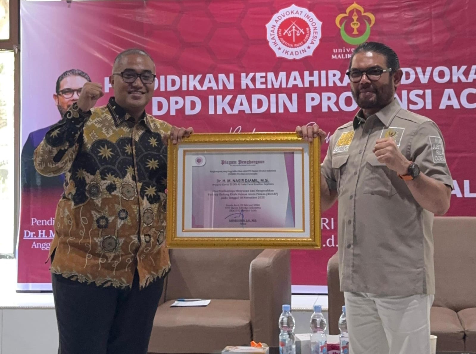 Penyerahan penghargaan tersebut berlangsung di Aula Sekretariat DPD RI Asal Aceh, Banda Aceh, Selasa 10 Februari 2026, dan disaksikan oleh peserta Pendidikan Kemahiran Advokat (PKA) yang diselenggarakan DPD IKADIN Aceh bekerjasama dengan Fakultas Hukum Universitas Malikussaleh (Unimal).