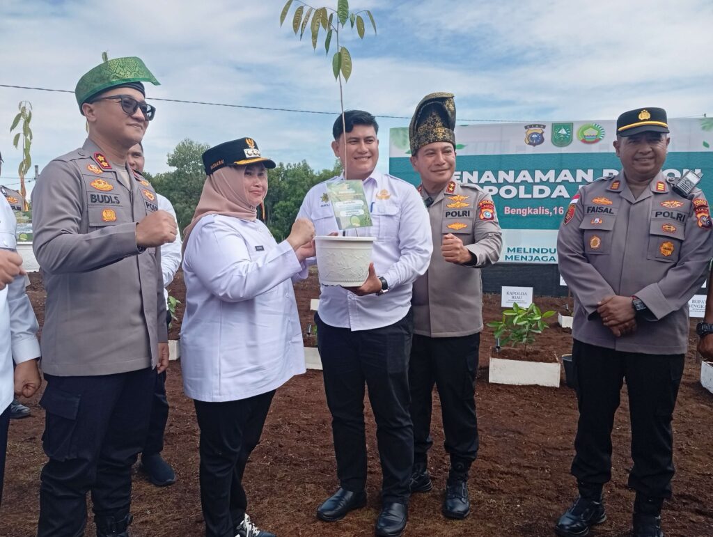 Bengkalis – Mengantisipasi potensi kebakaran hutan dan lahan (karhutla) pada musim kemarau ekstrem yang diprediksi terjadi mulai Juni 2025, Kapolda Riau Irjen Pol Dr. Herry Heryawan, S.I.K, M.H bersama Bupati Bengkalis Kasmarni melakukan penanaman pohon geronggang di Kampung Tangguh, Kabupaten Bengkalis, Rabu (16/4/2025).