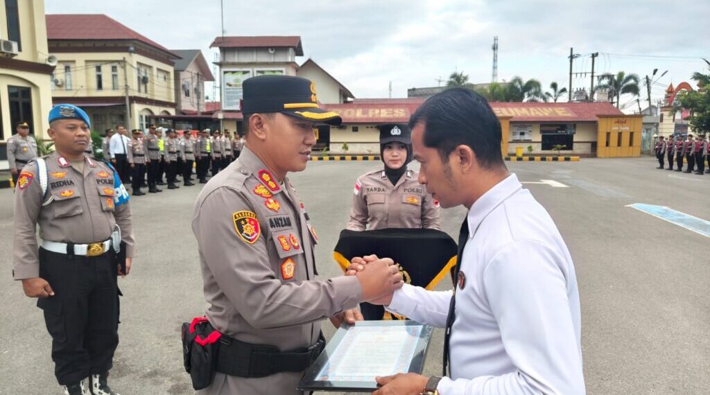 LHOKSEUMAWE – Dedikasi dan pengorbanan anggota Polri dalam misi kemanusiaan kembali mendapat apresiasi. Kapolres Lhokseumawe AKBP Dr. Ahzan, S.H., S.I.K., M.S.M., M.H memimpin langsung upacara pemberian penghargaan kepada Aipda Maulizar, Kanit Intel Polsek Sawang, yang berlangsung di halaman Satya Haprabu Polres Lhokseumawe, Senin (12/1/2026) pagi.