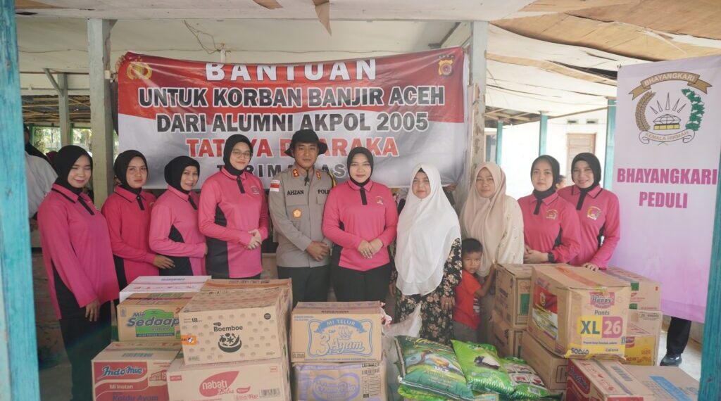 Aceh Utara — Kapolres Lhokseumawe AKBP Dr. Ahzan, S.H., S.I.K., M.S.M., M.H. bersama Ketua Bhayangkari Polres Lhokseumawe Ny. Ita Ahzan menyerahkan bantuan sosial dari Alumni Akpol 2005 (Thathiya Dharaka) kepada masyarakat Desa Ulee Blang, Kecamatan Nisam, Kabupaten Aceh Utara, Jumat (23/1/2026).