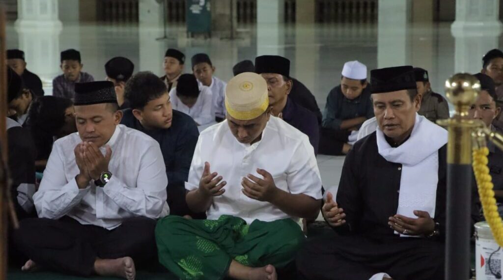 Lhokseumawe – Kapolres Lhokseumawe, AKBP Dr. Ahzan, S.H., S.I.K., M.S.M., M.H., bersama ratusan jemaah mengikuti salat gerhana di Masjid Agung Islamic Center Kota Lhokseumawe, Sabtu (07/09/2025).