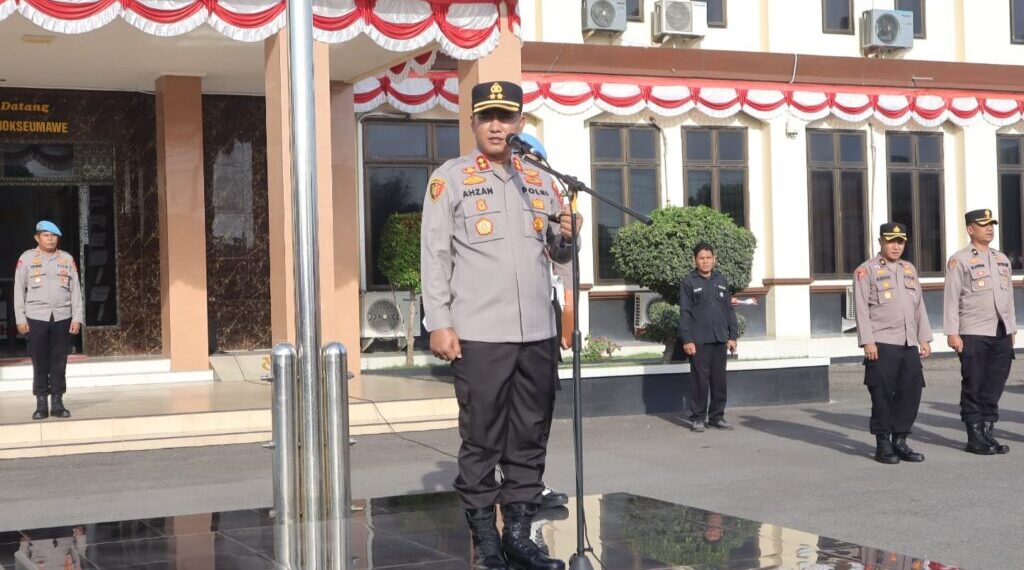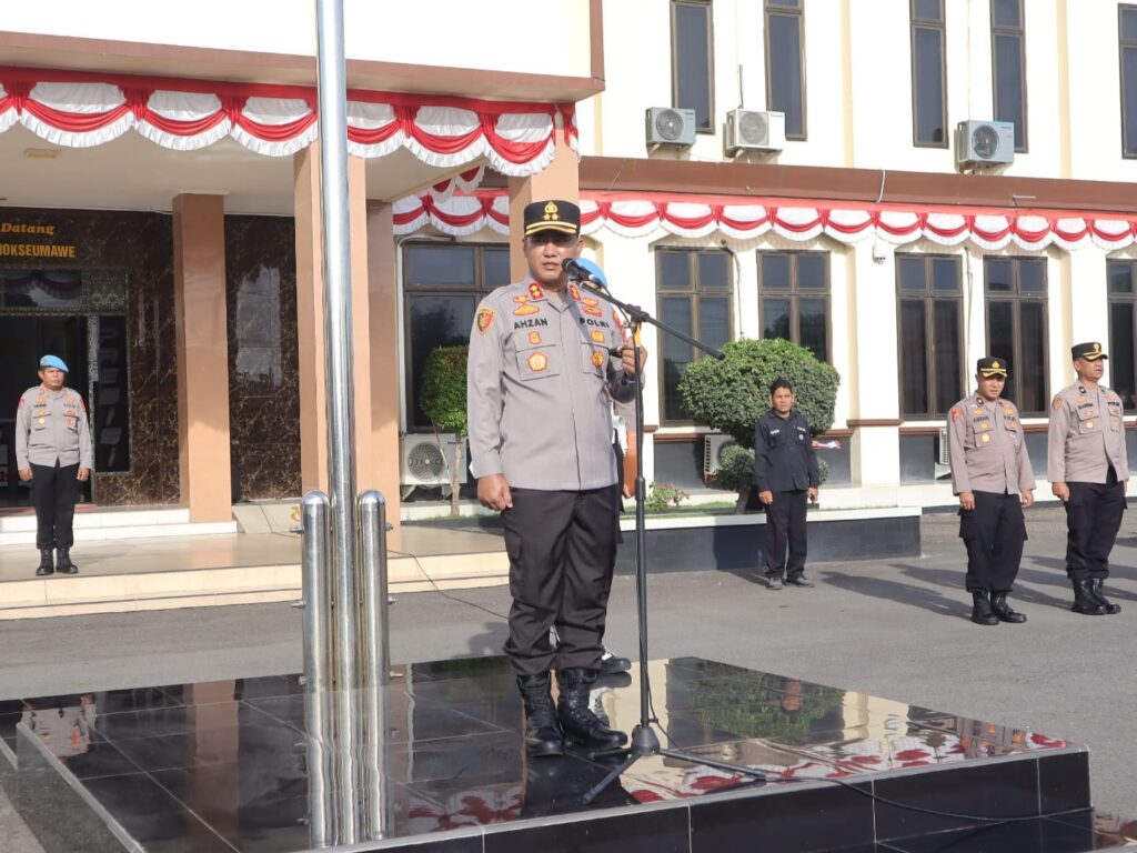 Lhokseumawe – Kapolres Lhokseumawe, AKBP Dr. Ahzan, S.H., S.I.K., M.S.M., M.H memimpin apel pagi di halaman Mapolres Lhokseumawe, Senin (26/8/2025). Dalam arahannya, Kapolres menyampaikan program Kapolda Aceh yang baru Brigjen Pol Drs. Marzuki Ali Basyah, M.M dengan tagline “Polda Meutuah, Menuju Aceh Meusyeuhu” sebagai landasan kerja seluruh personel kepolisian di wilayah hukum Polres Lhokseumawe.
