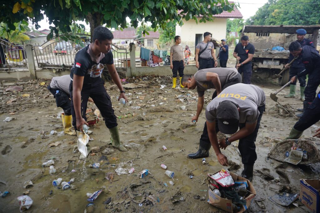 Dalam kegiatan tersebut, personel Polres Lhokseumawe bersama warga setempat bergotong royong membersihkan lumpur, sampah, serta sisa material banjir yang menggenangi bagian dalam dan sekitar meunasah. Upaya ini dilakukan guna mempercepat pemulihan fasilitas ibadah agar dapat kembali digunakan secara nyaman dan aman oleh masyarakat.
