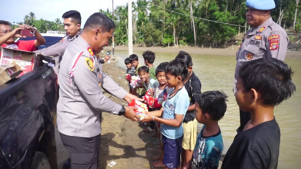 Dalam perjalanan menyusuri titik-titik banjir, rombongan terhenti ketika melihat sekelompok anak duduk murung di pinggir jalan Sawang. Wajah mereka tampak lelah, masih menyimpan rasa takut setelah banjir besar melanda wilayah tersebut. Melihat hal itu, Kapolres segera mendekat dan menyapa mereka dengan senyum hangat.