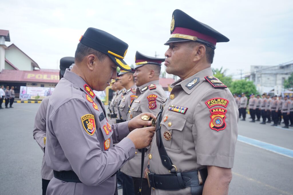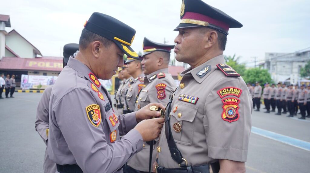 Lhokseumawe – Kapolres Lhokseumawe, AKBP Dr. Ahzan., S.H., S.I.K., M.S.M., M.H memimpin upacara serah terima jabatan (sertijab) Kabag Ops, Kasat Lantas, dan Kasat Binmas di Lapangan Satya Haprabu Polres Lhokseumawe, Senin (28/4/2025).