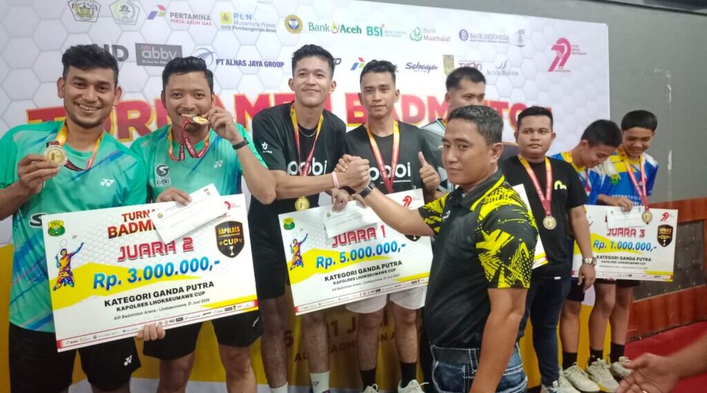 Lhokseumawe – Turnamen Badminton Kapolres Lhokseumawe Cup I resmi ditutup dalam sebuah seremoni yang berlangsung meriah di GOR Alif Badminton, Desa Mon Geudong, Kecamatan Banda Sakti, Kota Lhokseumawe, Sabtu malam (21/6/2025). Kegiatan ini merupakan bagian dari rangkaian peringatan Hari Bhayangkara ke-79 dan memperebutkan total hadiah sebesar Rp35 juta.