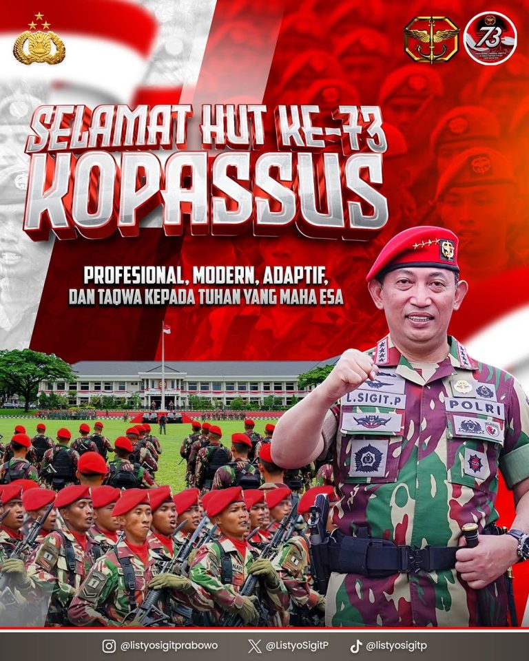 Jakarta, – Kepala Kepolisian Republik Indonesia (Kapolri) Jenderal Polisi Listyo Sigit Prabowo turut menyampaikan ucapan selamat memperingati Hari Ulang Tahun (HUT) ke-73 Komando Pasukan Khusus (Kopassus). Ucapan tersebut disampaikan Kapolri melalui unggahan di akun Instagram pribadinya, @listyosigitprabowo, yang dikutip pada Rabu, 16 April 2025.