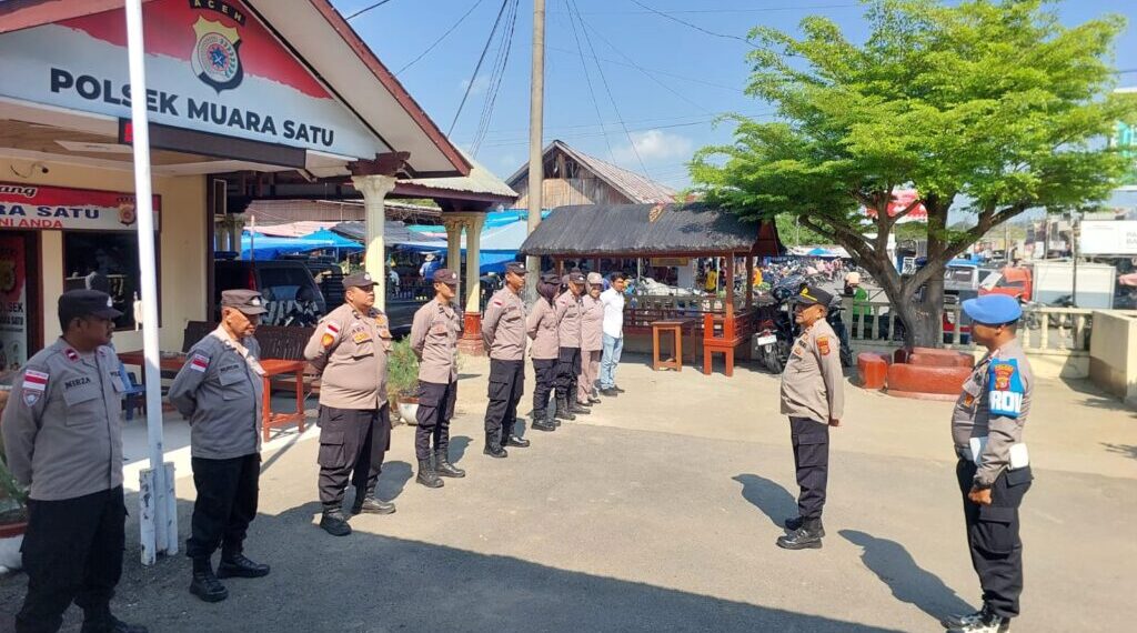 Lhokseumawe – Kapolsek Muara Satu Iptu Abdul Karim memimpin apel pagi personel Polsek Muara Satu di halaman Mapolsek Muara Satu Polres Lhokseumawe, Kamis (23/4/2026) pagi.