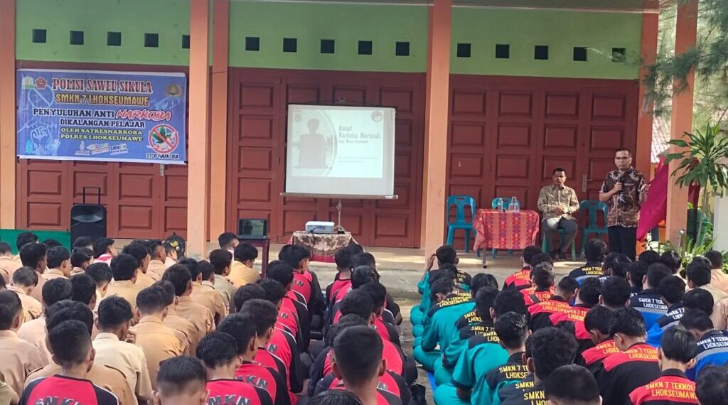 Lhokseumawe – Dalam upaya menekan penyalahgunaan narkoba di kalangan pelajar, Polres Lhokseumawe melalui Satuan Reserse Narkoba melaksanakan sosialisasi bahaya narkoba di SMKN 7 Lhokseumawe, Sabtu (4/10/2025) pagi.