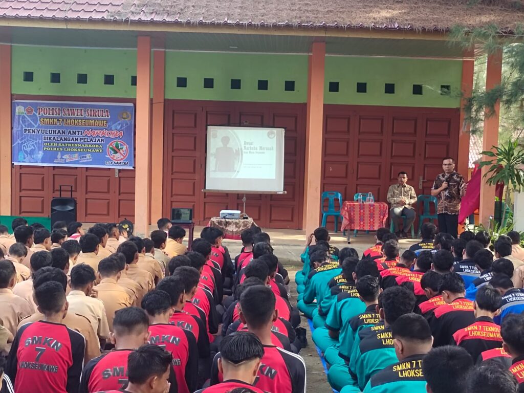 Lhokseumawe – Dalam upaya menekan penyalahgunaan narkoba di kalangan pelajar, Polres Lhokseumawe melalui Satuan Reserse Narkoba melaksanakan sosialisasi bahaya narkoba di SMKN 7 Lhokseumawe, Sabtu (4/10/2025) pagi.