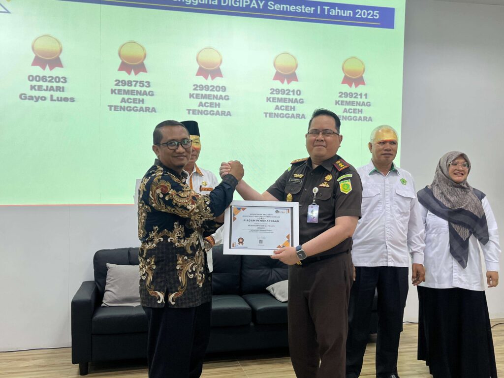 Piagam penghargaan diserahkan langsung oleh Kepala KPPN Kutacane, Deni Haryono, kepada Kepala Kejaksaan Negeri Gayo Lues, Heri Yulianto, S.H., M.H.
