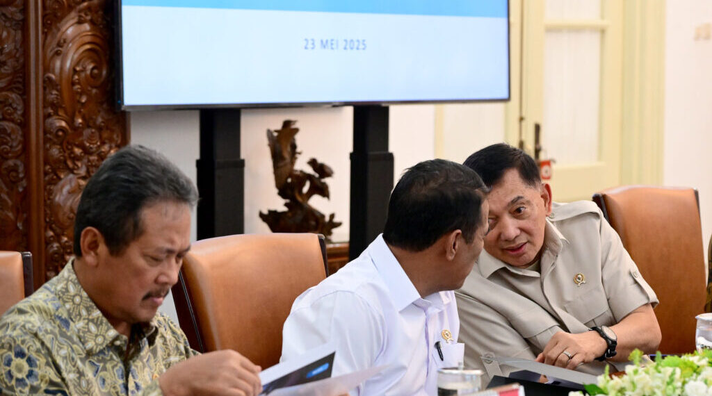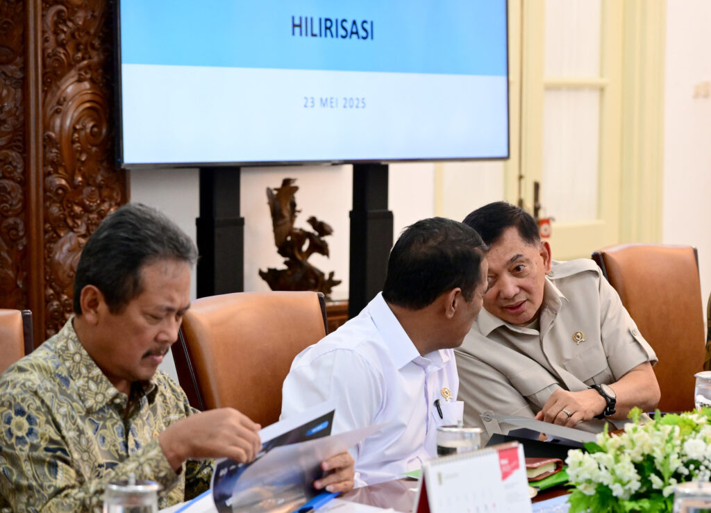Jakarta – Menteri Pertahanan RI Sjafrie Sjamsoeddin bersama sejumlah menteri dan Satgas Hilirisasi menghadiri rapat terbatas (ratas) yang dipimpin oleh Presiden RI Prabowo Subianto, di Istana Merdeka, Jakarta, pada Jumat, (23/5/2025). Rapat tersebut dilaksanakan guna membahas percepatan proyek hilirisasi nasional dan tindak lanjut terhadap proyek prioritas hilirisasi yang mencakup berbagai sektor strategis.