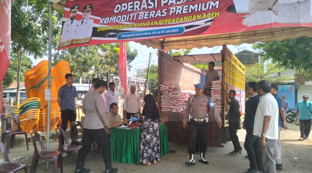 Aceh Utara — Polsek Dewantara pastikan keamanan kemananan operasi pasar komoditi Beras yang digelar Perum Bulog bekerja sama dengan Disprindagkop Kabupaten Aceh di Desa Keude Krueng Geukueh, Kecamatan Dewantara, Kabupaten Aceh Utara, Rabu (30/7/2025) pagi.