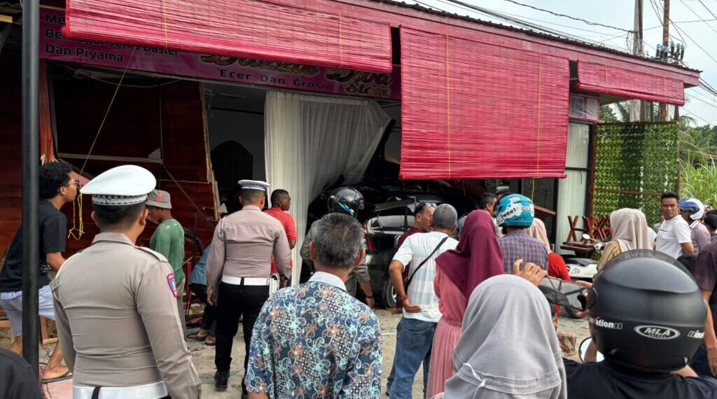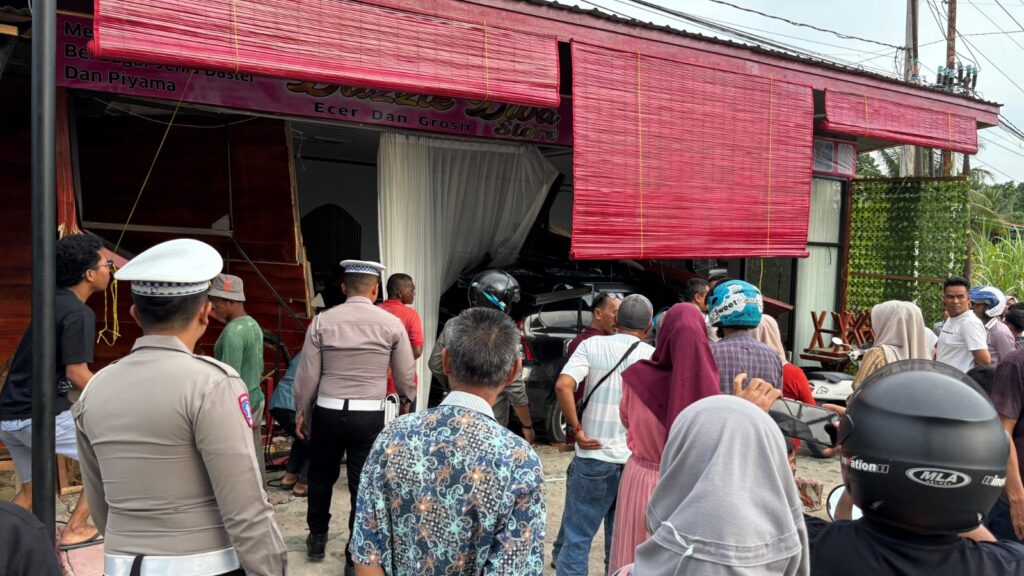 ACEH UTARA – Satu unit toko yang menjual daster dan piyama di pinggiran jalan Medan – Banda Aceh, Gampong Meunasah Reudeup, Kecamatan Lhoksukon, Aceh Utara, Jumat sore, 12 September 2025, rusak parah setelah dihantam mobil Toyota Avanza. Dalam laka tunggal tersebut, tidak ada korban jiwa.