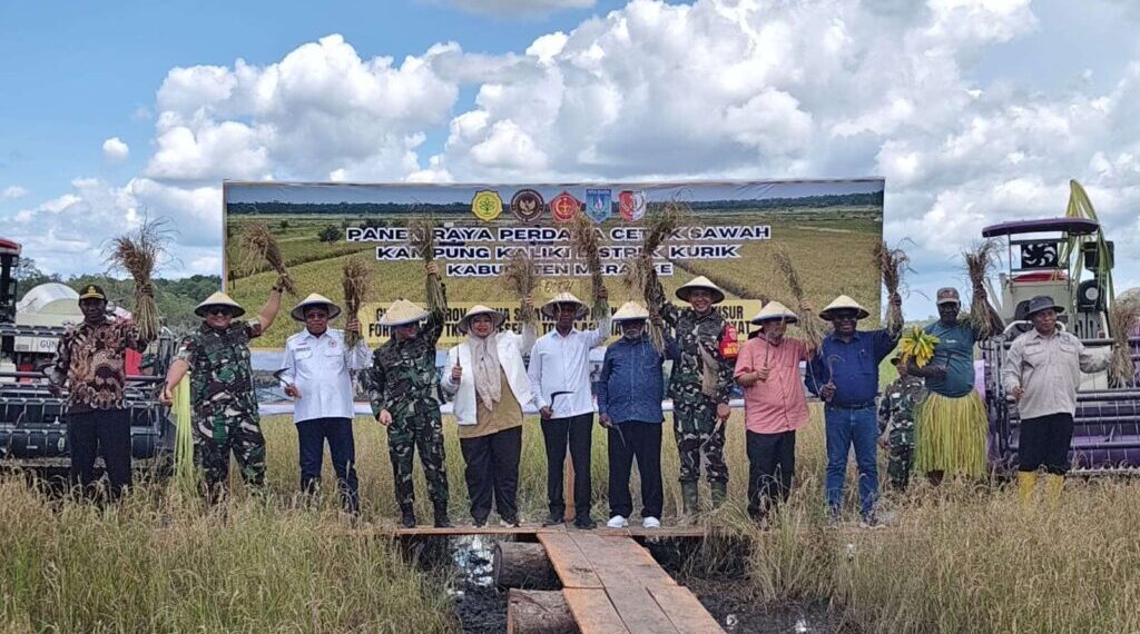 MERAUKE-Masyarakat lokal kampung Kaliki Distrik Kurik Kabupaten Merauke, Papua Selatan melakukan panen raya padi perdana diareal lahan persawahan seluas 43 hektar. Panen raya tersebut dihadiri langsung Gubernur dan Wakil Gubernur Papua Selatan Apolo Safanpo – Paskalis Imadawa dan Bupati – Wakil Bupati Merauke Yoseph Bladip Gebze – Fauzan Nihayah, Anggota Komisi IV DPR RI H. Sulaiman L. Hamzah, TNI, Polri, Forkopimda dan masyarakat lokal kampung Kaliki.