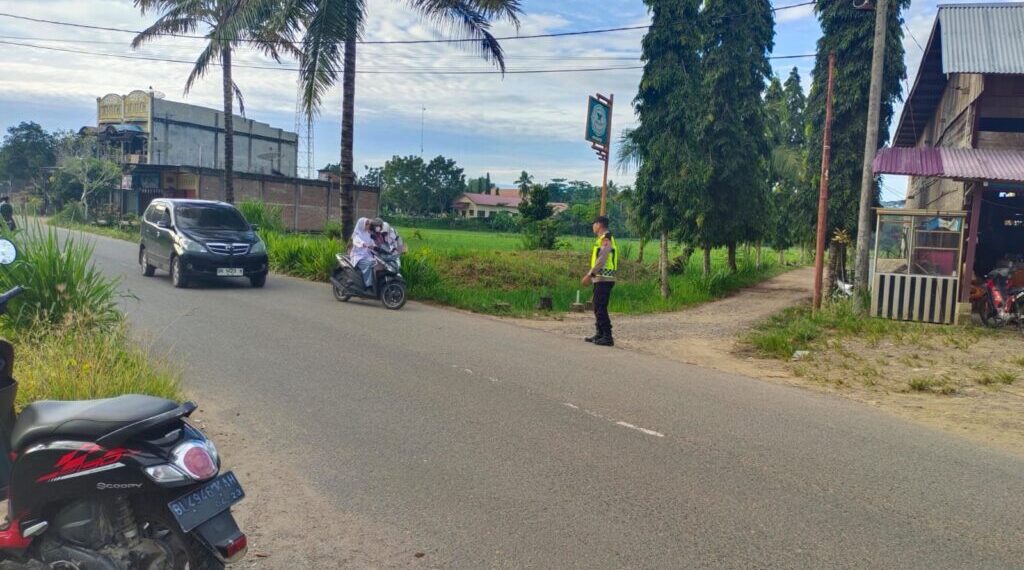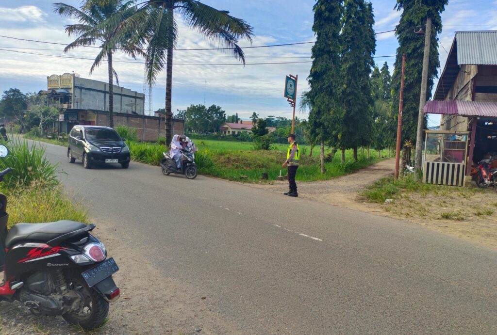 Lhokseumawe: Personel Polsek Samudera melaksanakan strong poin atau pengaturan lalu lintas di kawasan Nisam , Aceh Utara, wilayah hukum Polres Lhokseumawe, rabu (4/9/2024) pagi.