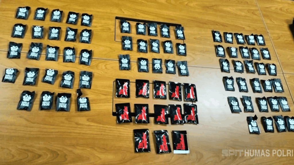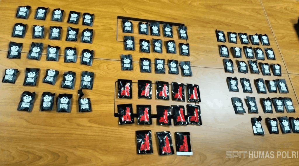 “Dari tangan tersangka ini kami sita barang bukti 68 bungkus bertulisan SHIELD FROG dan 13 bungkus bertulisan THE GODFATHER vape berisi cairan yang diduga mengandung zat etomidate, dan tiga digunakan pihak Bea Cukai untuk pemeriksaan lab,” ungkapnya.