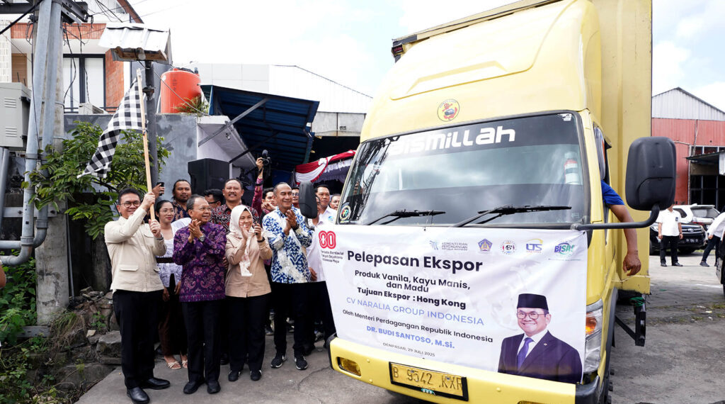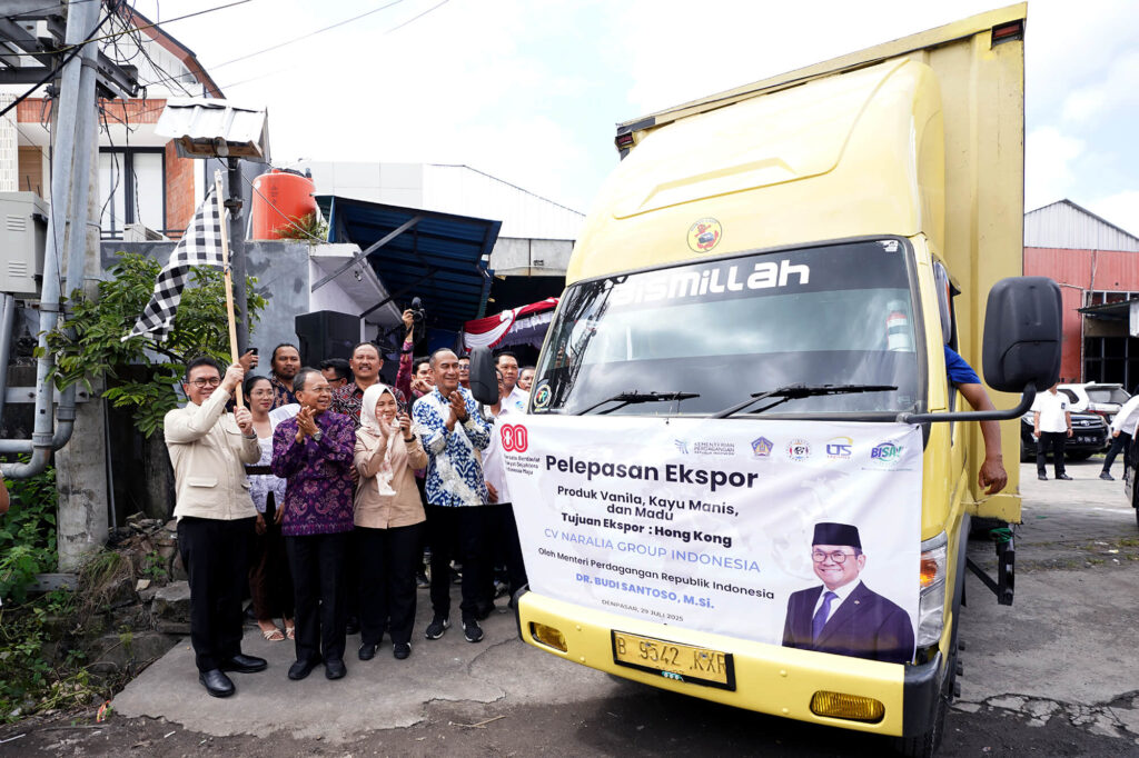 Menteri Perdagangan, Budi Santoso bersama Gubernur Bali, I Wayan Koster melepas ekspor produk rempah seperti vanili, kayu manis, pala; serta madu produksi UMKM Bali, CV Naralia senilai USD 350.000 atau setara Rp5,6 miliar di Denpasar, Bali, Selasa (29 Jul).