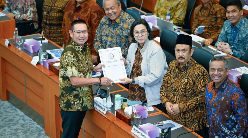 Jakarta – Menteri Keuangan Sri Mulyani Indrawati bersama Gubernur Bank Indonesia Perry Warjiyo dan Menteri PPN/Kepala Bappenas Rachmat Pambudy menghadiri Rapat Kerja bersama Badan Anggaran (Banggar) DPR RI pada Senin (22/7). Rapat tersebut membahas dan mengesahkan laporan dari Panitia Kerja (Panja) Banggar terkait pembicaraan pendahuluan Rancangan Anggaran Pendapatan dan Belanja Negara (RAPBN) Tahun Anggaran 2026 serta Rencana Kerja Pemerintah (RKP) 2026.