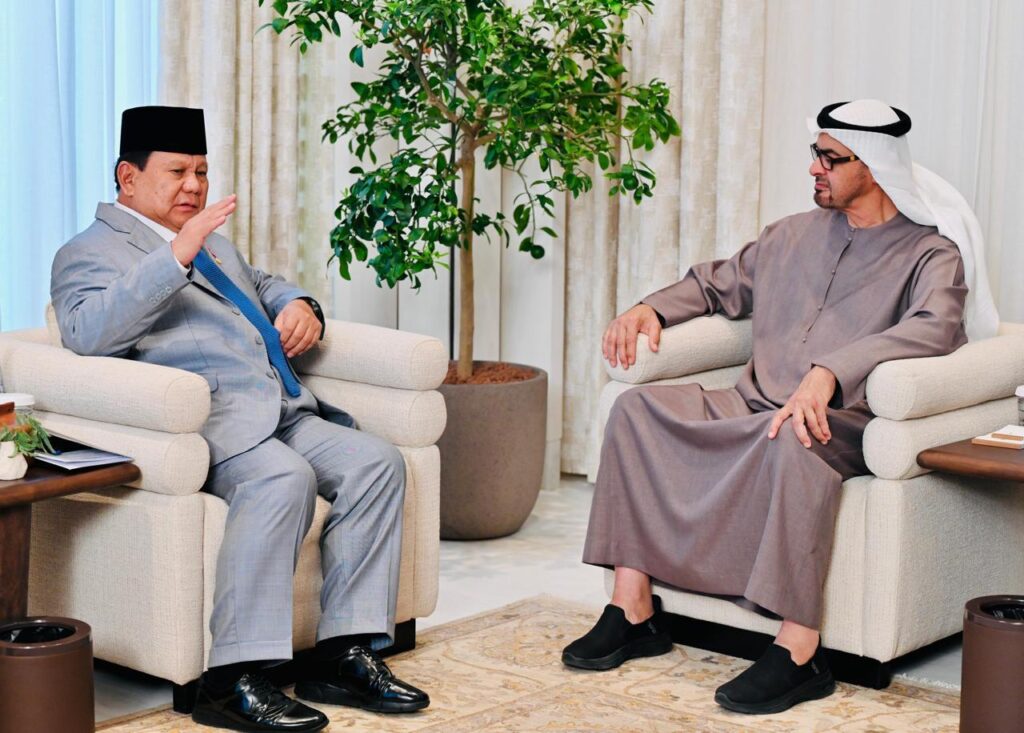 jakarta – Presiden Republik Indonesia (RI) Prabowo Subianto dan Presiden Persatuan Emirat Arab (PEA) Mohamed bin Zayed Al Nahyan (MBZ) mendengarkan secara langsung pengumuman delapan memorandum of understanding (MoU) dan letter of intent (LoI) yang telah disepakati dan ditandatangani oleh kedua negara. Pengumuman tersebut dilakulan di akhir pertemuan bilateral kedua pemimpin negara yang digelar di Istana Qasr Al Shatie, Abu Dhabi, Rabu (09/04/2025).