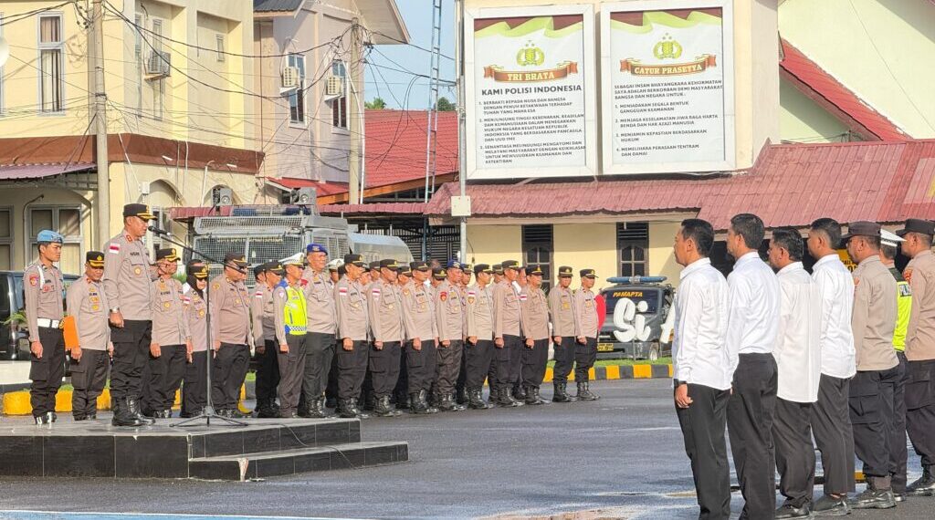 Lhokseumawe — Kapolres Lhokseumawe AKBP Dr. Ahzan, S.I.K., M.S.M., M.H., memberikan arahan sekaligus motivasi kepada seluruh personel saat memimpin apel pagi di halaman Mapolres Lhokseumawe, Senin (29/12/2025).