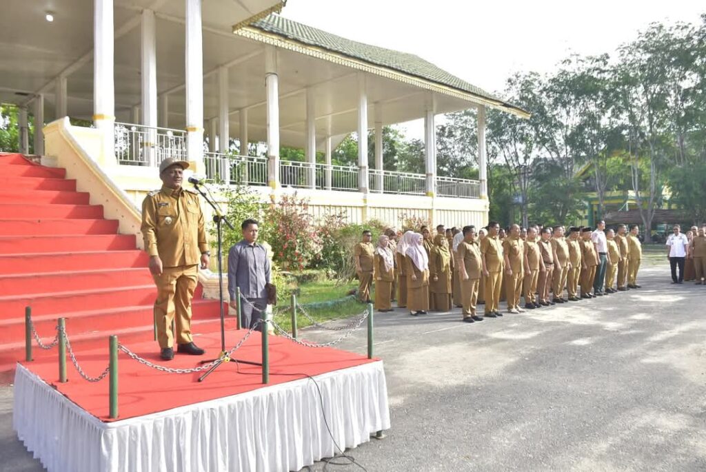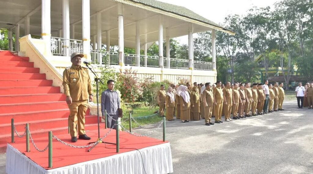 Karang Baru – Dalam apel perdana, Bupati diwakili oleh Wakil Bupati Aceh Tamiang Ismail SE.I memimpin apel perdana seluruh Aparatur Sipil Negara (ASN) dilapangan upacara tribun belakang kantor Bupati.Senin 24 Februari 2025.