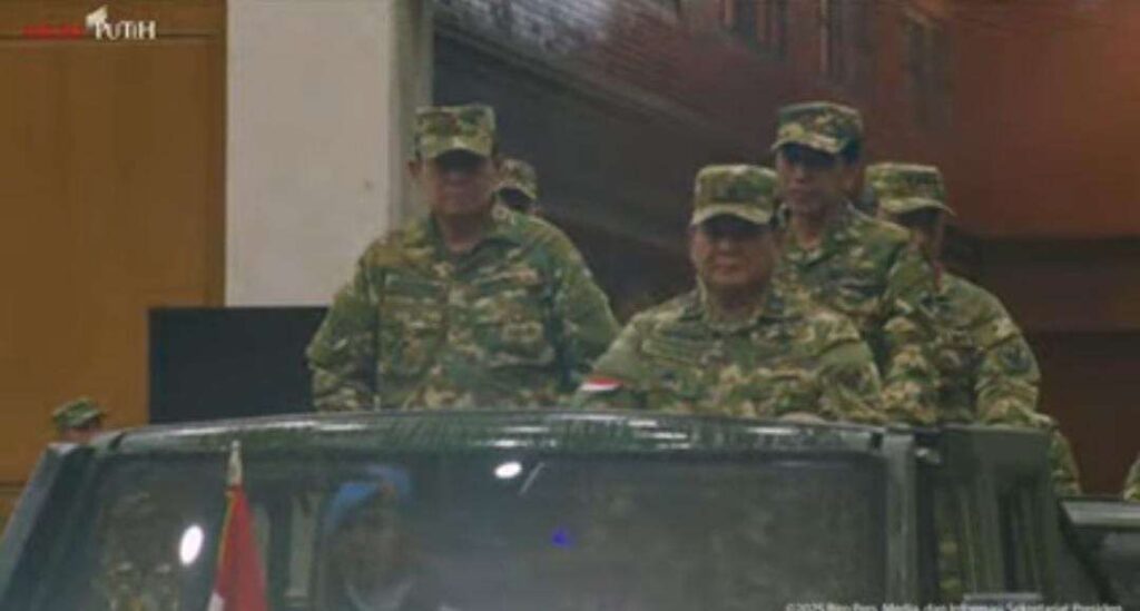 Magelang – Presiden Prabowo Subianto memimpin Parade Senja dan upacara penurunan Merah Putih. Parade dan upacara berlangsung di Lapangan Pancasila, Akademi Militer Magelang, Jawa Tengah, Kamis (27/2/202/).