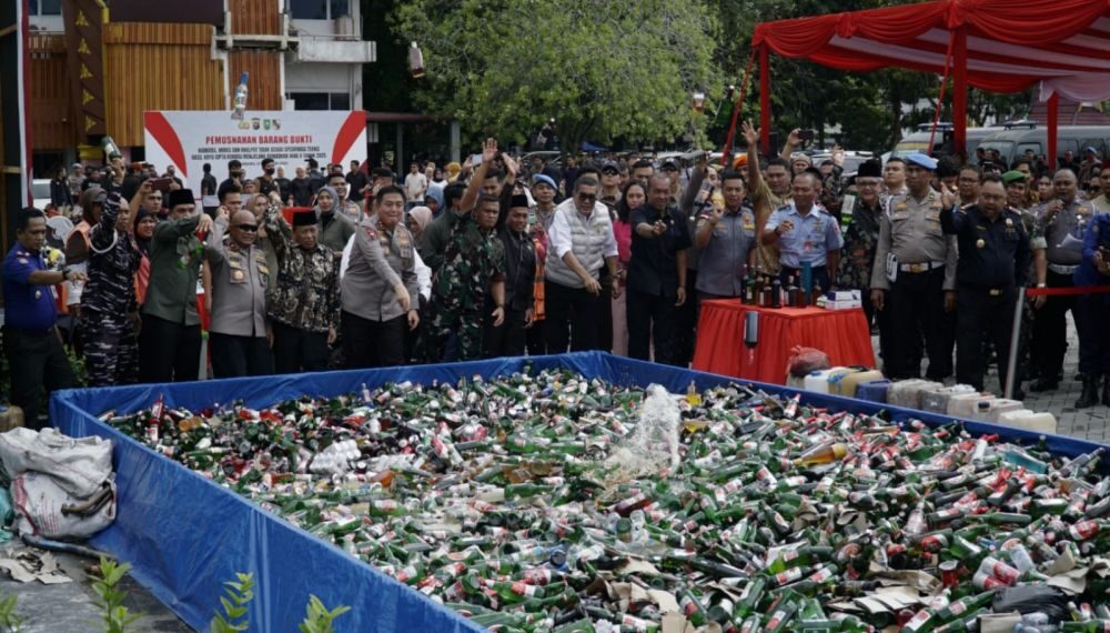 Ribuan botol miras digilas menggunakan alat berat, ganja dibakar dalam wadah khusus, sementara sabu dilarutkan dalam air mendidih setelah terlebih dahulu diuji keasliannya.