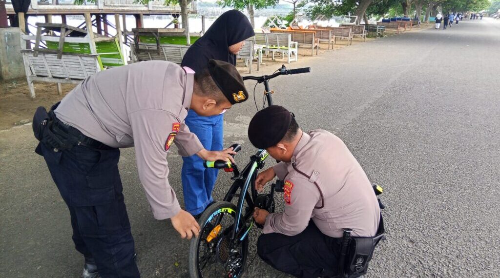 Lhokseumawe – Personel Sat Pamobvit Polres Lhokseumawe menunjukkan kepedulian di tengah tugas pengamanan Car Free Day (CFD) di Waduk Pusong, Minggu pagi (5/10/2025). Saat berpatroli, petugas membantu sekelompok anak-anak yang sepeda mereka putus rantai saat berolahraga.
