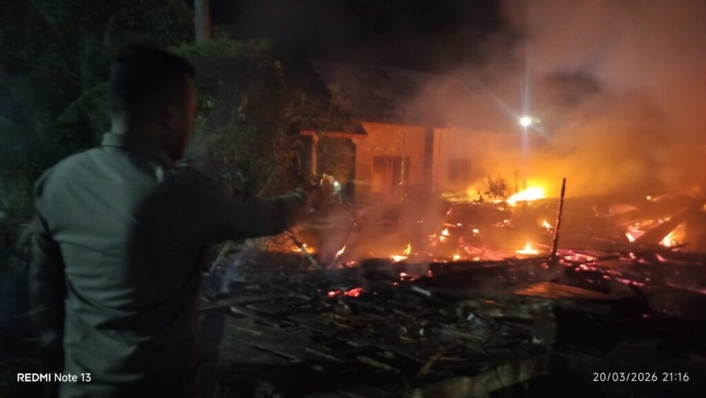 Lhokseumawe — Personel kepolisian dari Polsek Blang Mangat bergerak cepat mendatangi tempat kejadian perkara (TKP) kebakaran yang menghanguskan tiga unit rumah warga di Dusun Cot Rancong, Desa Mane Kareung, Kecamatan Blang Mangat, Kota Lhokseumawe, Jumat (20/3/2026) malam.
