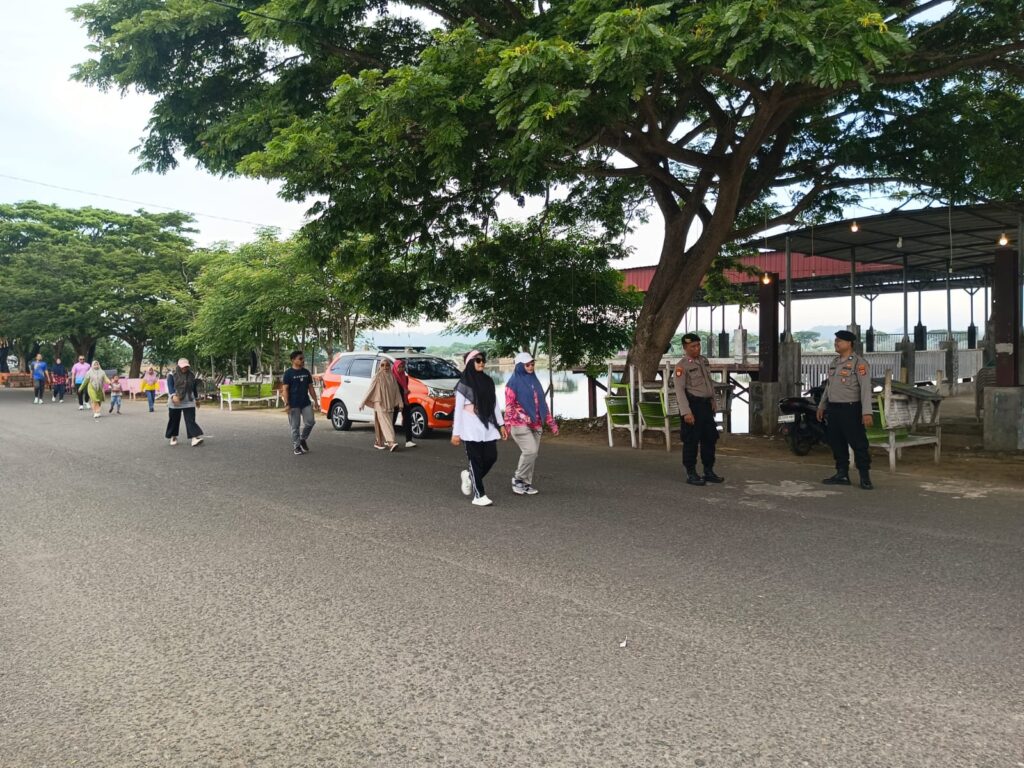Lhokseumawe – Suasana akhir pekan di Waduk Pusong, Kecamatan Banda Sakti, Kota Lhokseumawe, tampak lebih aman dengan kehadiran personel Sat Pamobvit Polres Lhokseumawe yang melakukan patroli dan pengamanan, Minggu pagi (14/9/2025).