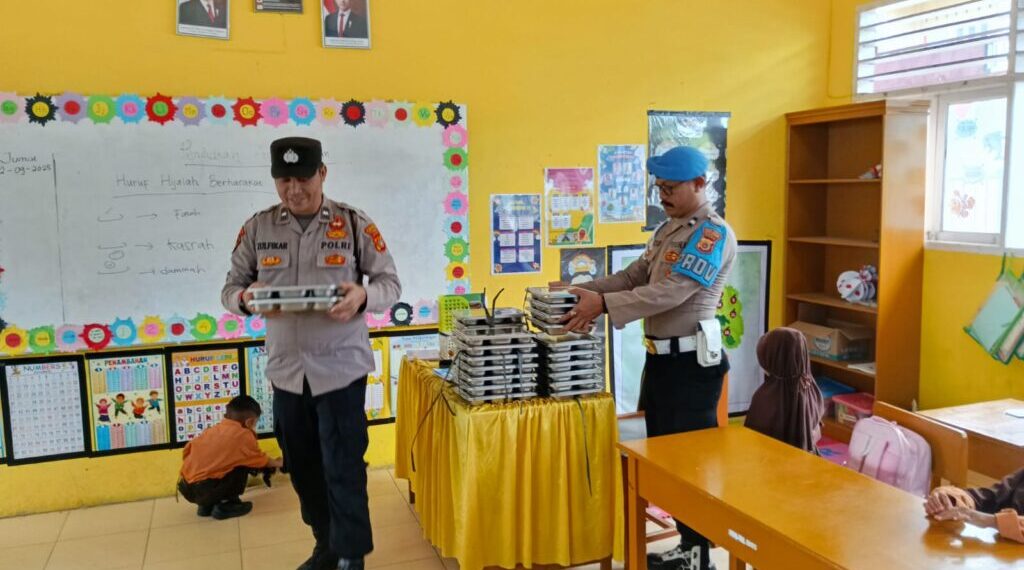 Aceh Utara – Personel kepolisian turut mengawal jalannya pembagian 2.605 paket Makan Bergizi Gratis (MBG) dari Badan Gizi Nasional (BGN) kepada siswa-siswi di Kecamatan Dewantara, Kabupaten Aceh Utara, Jumat (12/09/2025). Kehadiran polisi bertujuan memastikan distribusi berjalan aman, tertib, dan lancar.