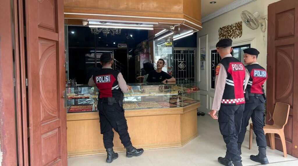 LHOKSEUMAWE – Sejumlah personel Polres Lhokseumawe terlihat menyusuri deretan pertokoan emas di kawasan pusat kota, Sabtu (11/10/2025) pagi. Dengan sikap waspada namun ramah, petugas menyapa para pedagang dan pengunjung sambil memantau situasi sekitar.